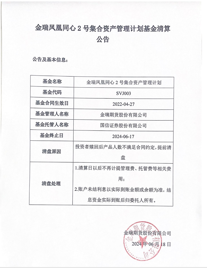 金瑞凤凰同心2号集合资产管理计划基金清算公告